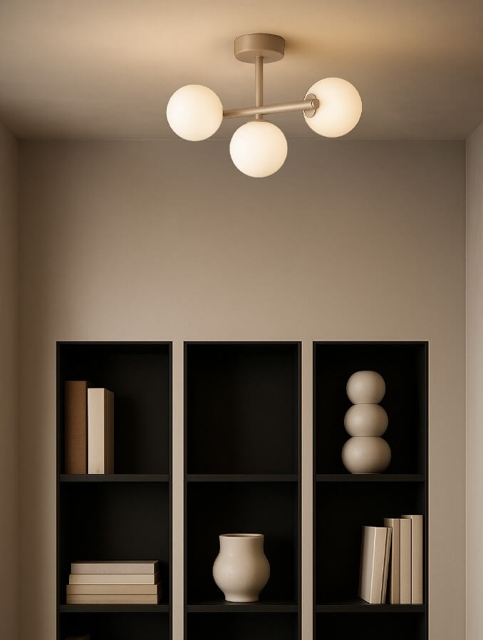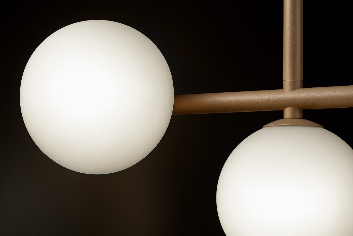 Lampa w kolorystyce ciepłego beżu z trzema mlecznobiałymi, szklanymi kulami.