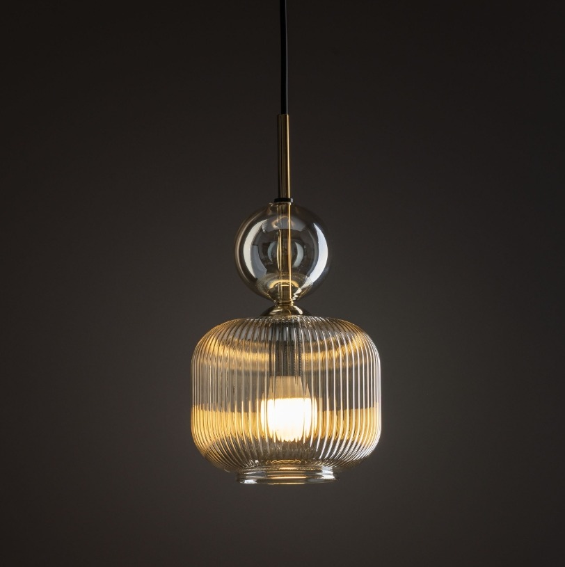 Lampa wisząca Sophia 15 posiada ryflowany klosz ze szkła w ciepłym odcieniu koniaku, a szklana kula nad nim przyciąga wzrok subtelnym połyskiem. Sprawdzi się nad stolikiem kawowym, w kąciku czytelniczym albo przy łóżku jako pojedynczy zwis.