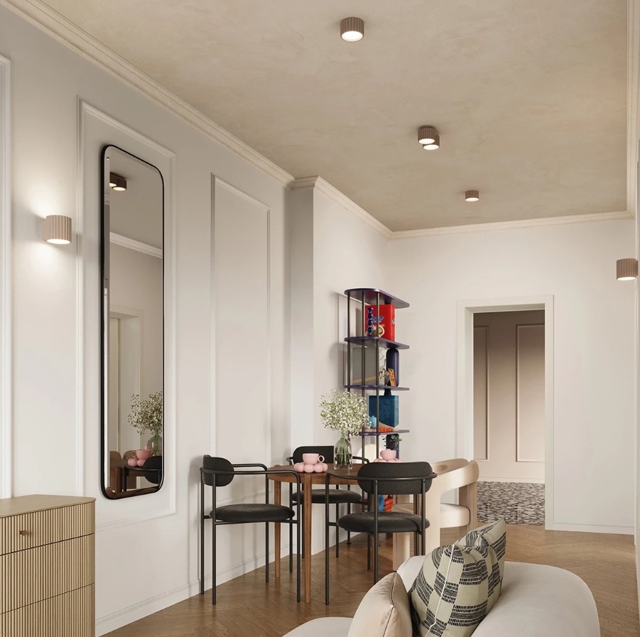 Beżowy spot sufitowy Aura 1- punktowy z charakterystycznym ryflowaniem.