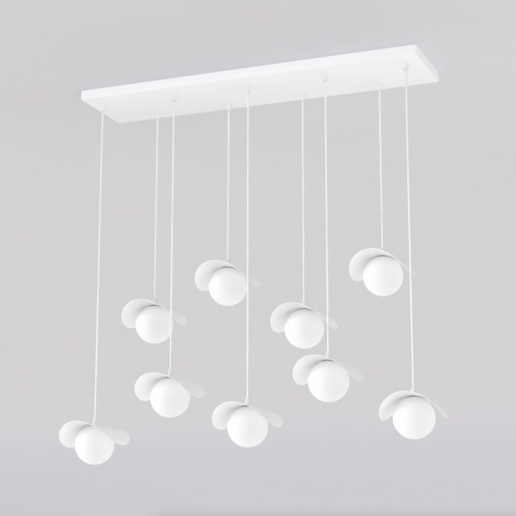 Ten biały żyrandol Ritual 9 to efektowna, designerska lampa wisząca z dziewięcioma kulistymi kloszami zawieszonymi na różnych wysokościach. Tworzy przestrzenną kompozycję, która pięknie wypełnia wnętrze nad stołem w salonie.