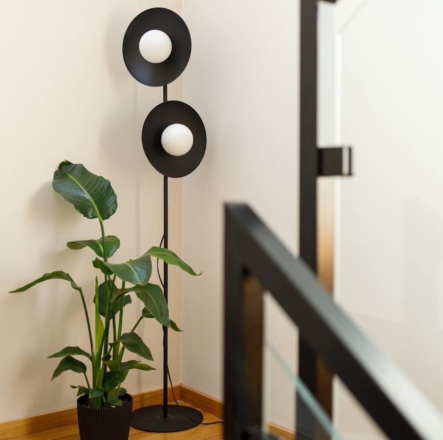 Czarna lampa podłogowa Slate wyróżnia się nowoczesna sylwetką. Lampa posiada dwie okrągłe, metalowe, czarne tarcze. Opalowe, mleczne klosze dają spokojny blask bez ostrego efektu, dzięki czemu wnętrze od razu robi się bardziej przytulne. Lampa sprawdzi się się przy sofie lub fotelu, kiedy zależy Ci na klimatycznym świetle wieczorem.