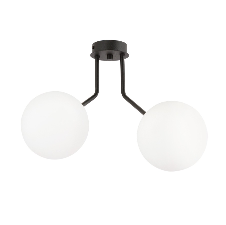 Czarna lampa sufitowa Nova 2 posiada matową konstrukcję z opalowymi szklanymi kulami, które dają miękkie i równomierne światło. Sprawdzi się w salonie i sypialni a także w korytarzu lub jadalni kiedy chcesz dodać wnętrzu eleganckiego spokoju.