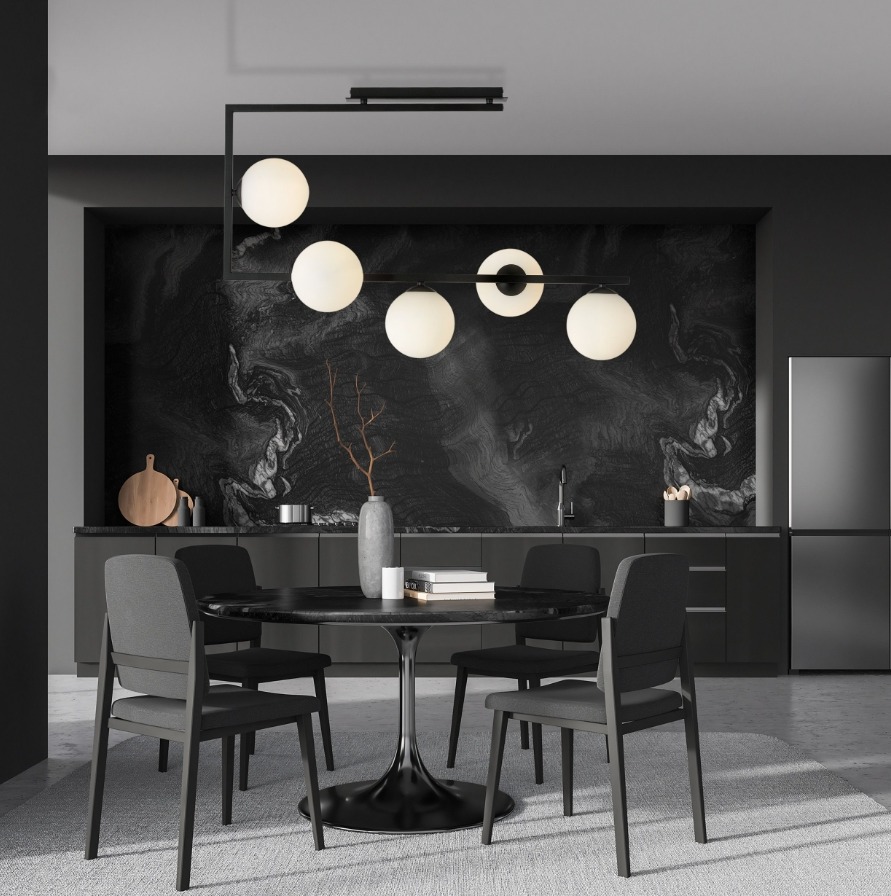 Czarna lampa sufitowa Soma 5 przyciąga uwagę lekką konstrukcją, a pięć kulistych kloszy z opalowego (mlecznego) szkła dodaje jej eleganckiego, nowoczesnego wyglądu. Mleczne wykończenie kloszy ładnie rozprasza światło, dzięki czemu w pomieszczeniu robi się jaśniej. Ten model pasuje do salonu, sypialni lub przedpokoju, gdy chcesz podkreślić centralną strefę wnętrza subtelnym detalem.