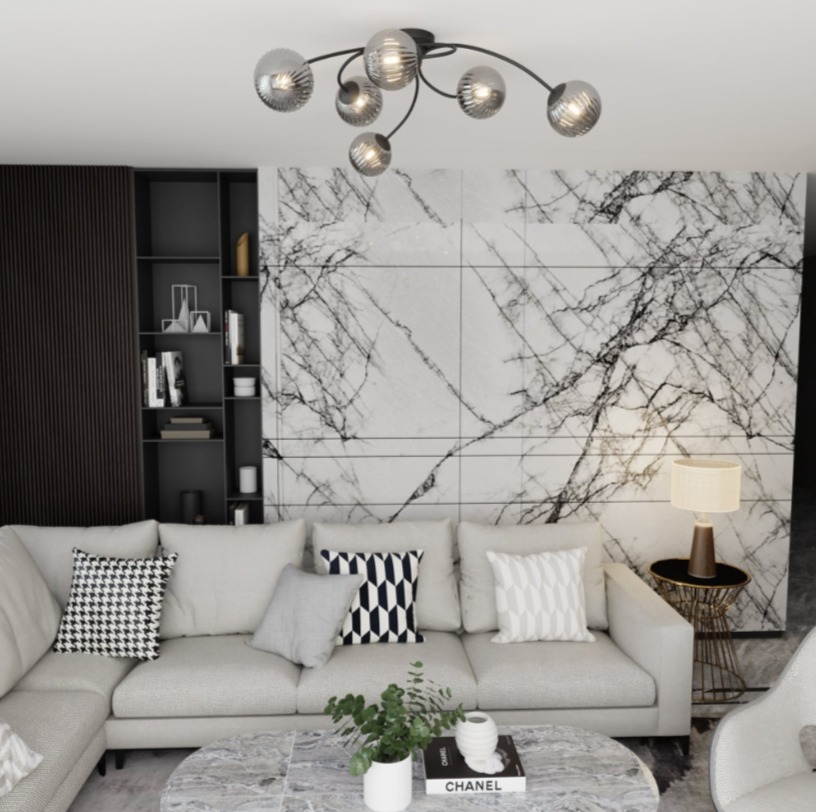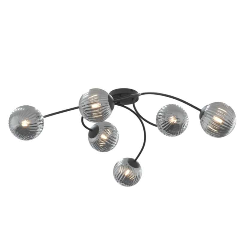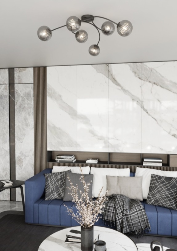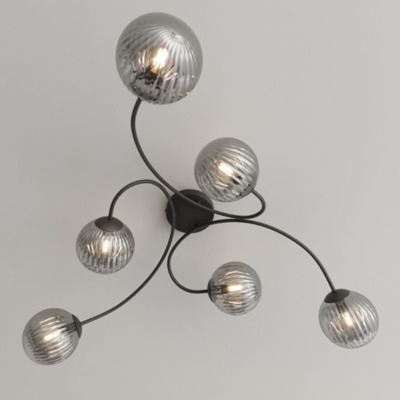 Lampa sufitowa Vibra 6 bl grafit wyróżnia się rozłożystą formą, która porządkuje przestrzeń i daje mocne poczucie symetrii na suficie. Grafitowe, szklane klosze delikatnie przygaszają blask, dzięki czemu światło jest przyjemniejsze. Sprawdzi się w strefie jadalnianej przy stole, w większym salonie albo w nowoczesnym przedpokoju.