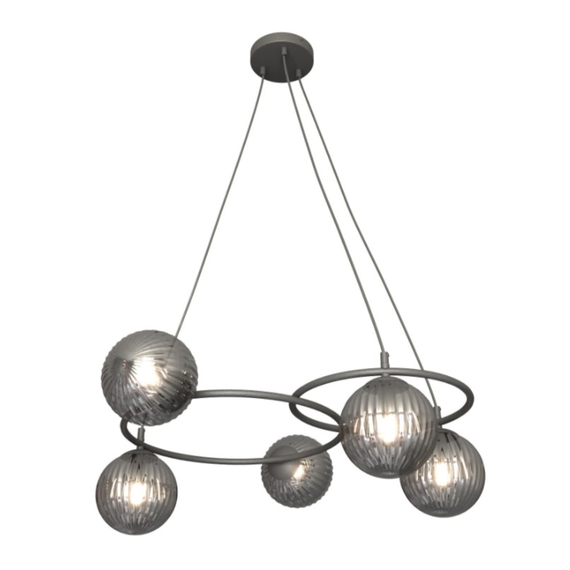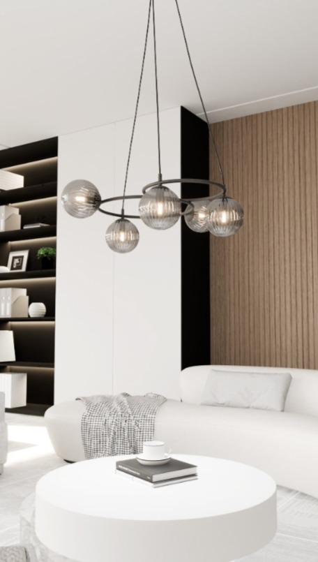 Lampa wisząca z czarnymi obręczami wygląda lekko i nowocześnie, a grafitowe klosze w kulistym kształcie dodają jej przyjemnej głębi. Ryflowane szkło subtelnie zmiękcza światło, dzięki czemu Libra 5 świetnie pasuje nad stół w jadalni, nad wyspę w kuchni albo do salonu, w którym ma być mocnym akcentem dekoracyjnym.