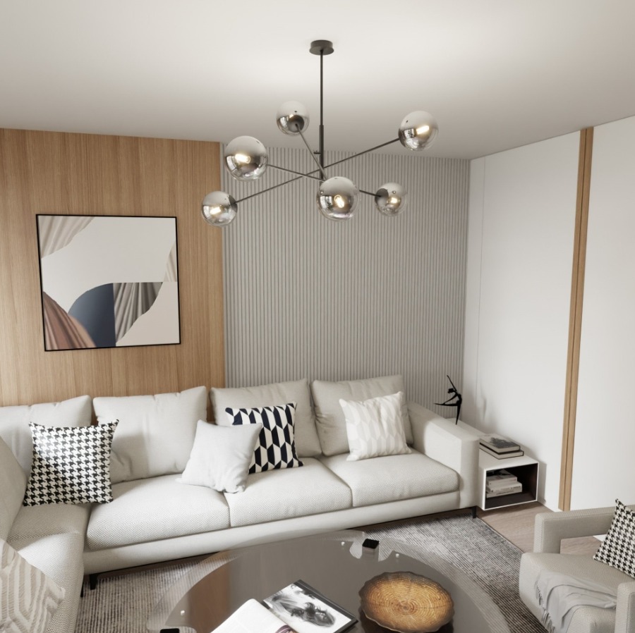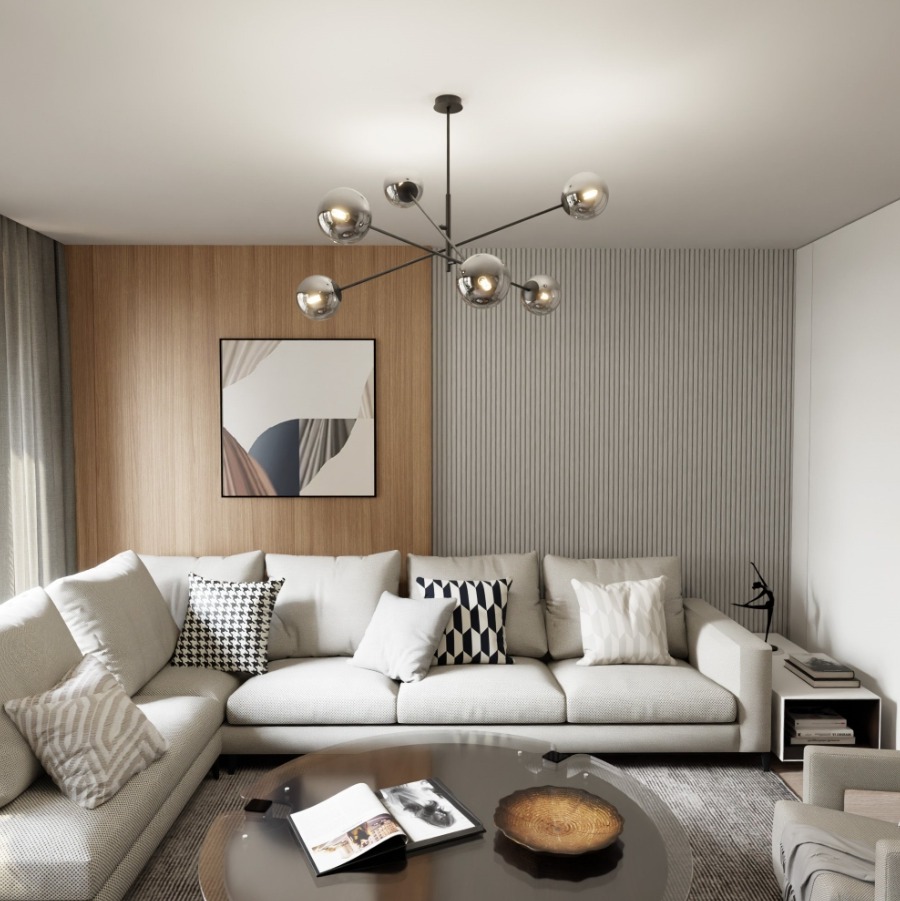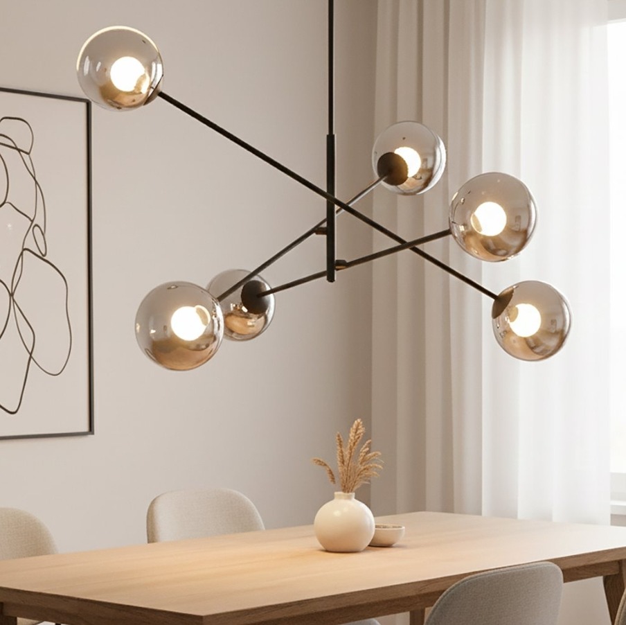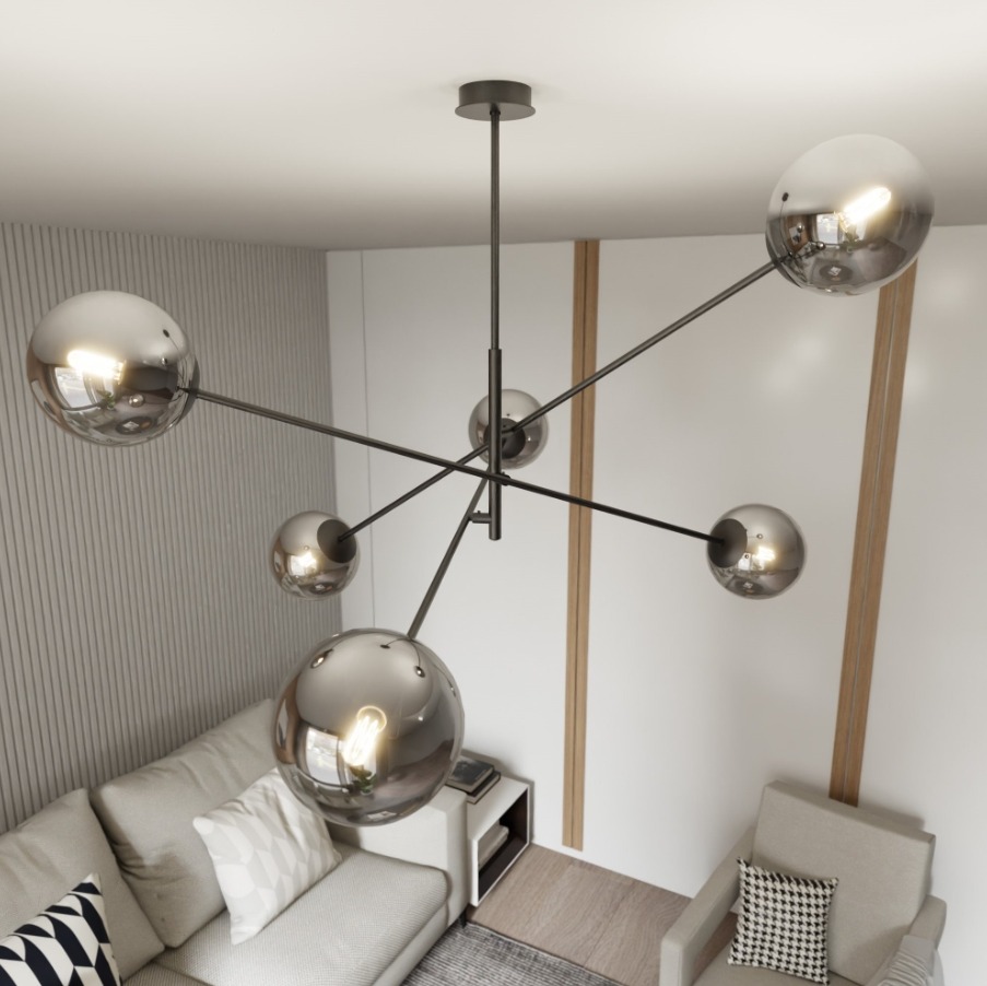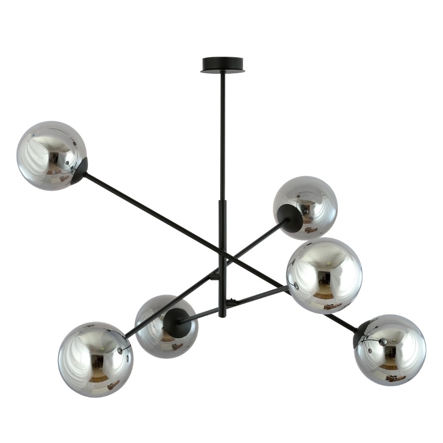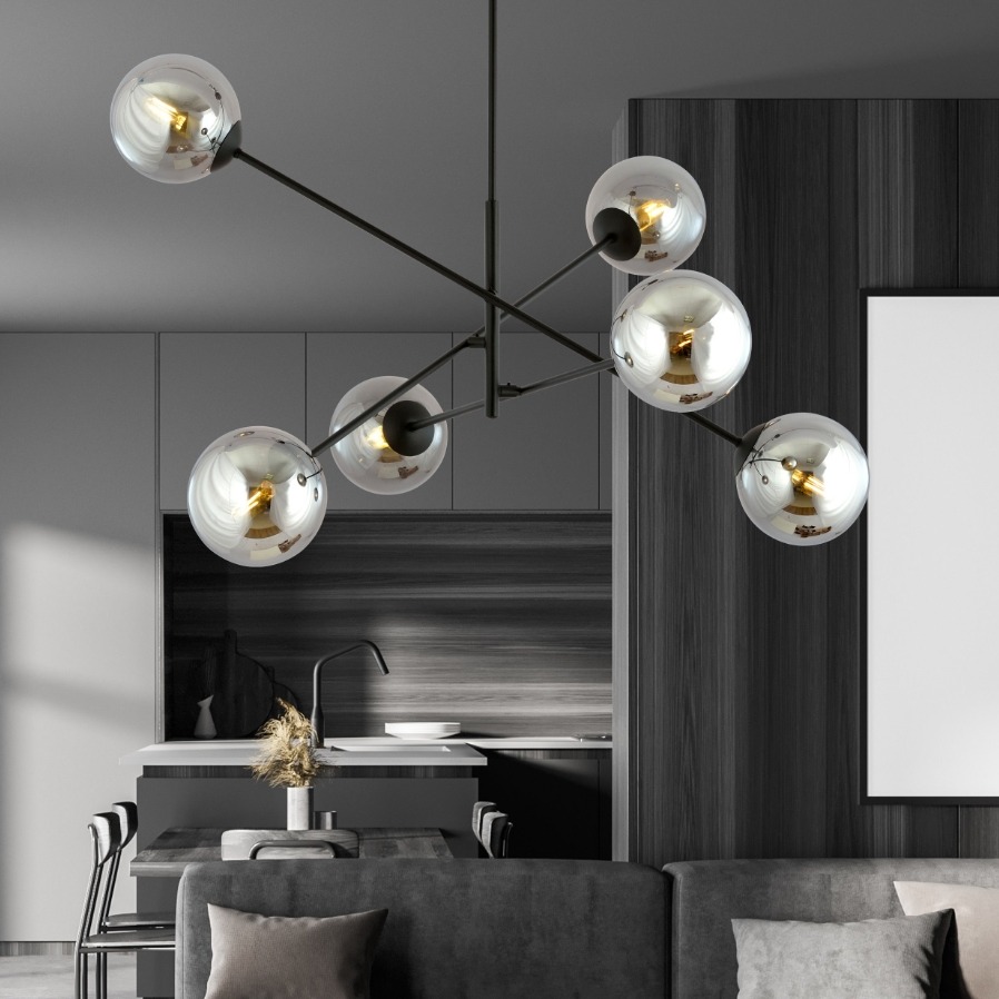 Czarny nowoczesny żyrandol Linear 6 ma smukłą formę i sześć grafitowych szklanych kul które przy zapaleniu światła dają głębszą bardziej wieczorową poświatę. To świetna opcja nad długi stół w jadalni nad kuchenną wyspą albo do otwartej strefy dziennej gdy chcesz równomiernie doświetlić większą powierzchnię i podkreślić styl loft.