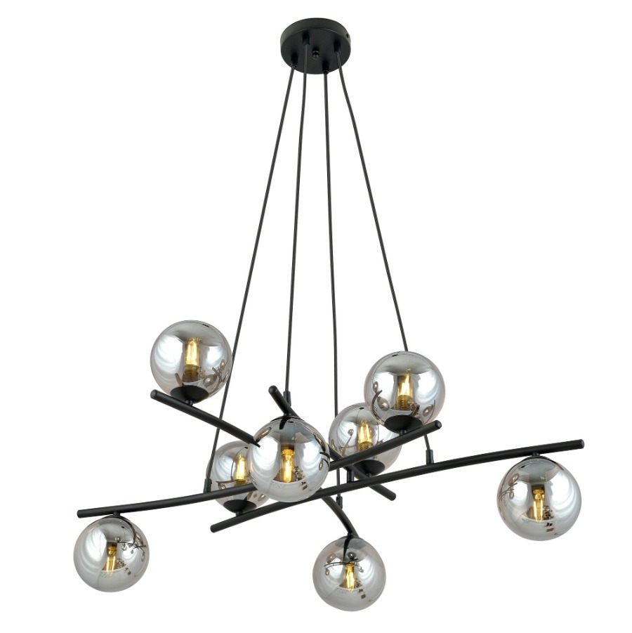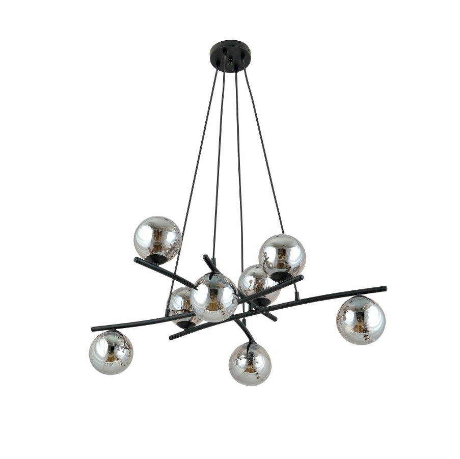 Lampa wisząca z ośmioma grafitowymi kulami, bo przydymione szkło dodaje światłu głębi i subtelnych refleksów. Najlepiej wypada nad dużym stołem w jadalni, nad długą wyspą lub w otwartej strefie dziennej, gdzie chcesz równomiernie rozłożyć światło i jednocześnie podkreślić aranżację czarną, designerską formą.
