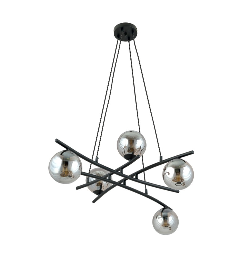Rozłożysty czarny żyrandol wiszący Essa 5 z pięcioma grafitowymi kulami buduje nastrojową głębię, gdyż szkło delikatnie przyciemnia światło. Sprawdzi się jako główne światło nad stołem w jadalni lub nad kuchenną wyspą a w otwartej strefie dziennej podkreśli aranżację wyrazistym loftowym akcentem.