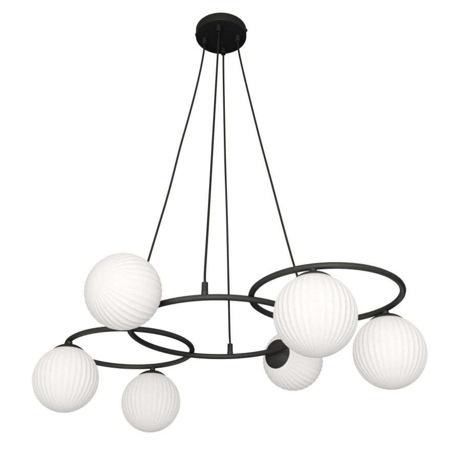 Nowoczesna lampa wisząca w czarnym wykończeniu przyciąga wzrok układem obręczy, na których rozmieszczono kuliste klosze z opalowego ryflowanego szkła. Światło rozchodzi się łagodnie i równomiernie. Libra 6 pięknie się prezentuje nad stołem w jadalni, kuchni, w otwartym salonie z aneksem albo w reprezentacyjnym korytarzu.