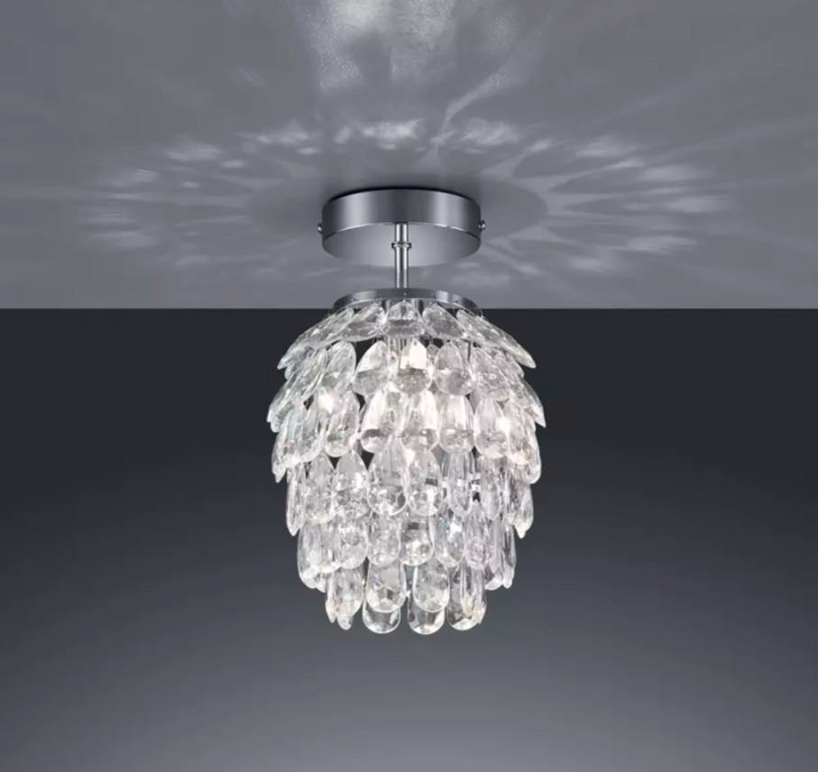 Dekoracyjna lampa sufitowa Petty z kloszem z transparentnych akrylowych elementów ułożonych kaskadowo, które mocno błyszczą i rozpraszają światło. Dzięki temu uzyskujemy efekt biżuteryjnej lampy glamour i dobrze wygląda w salonie, sypialni lub korytarzu.