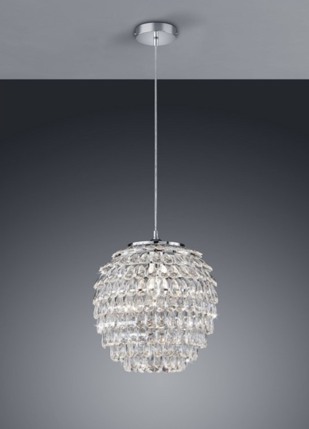 Efektowna lampa wisząca w stylu glamour z chromowanym zawieszeniem i kloszem z przezroczystych, błyszczących zawieszek z tworzywa, które pięknie rozpraszają światło. Klosz ma formę dekoracyjnej kuli o średnicy 35 cm, dzięki czemu lampa mocno przyciąga wzrok nad stołem w jadalni lub w salonie.