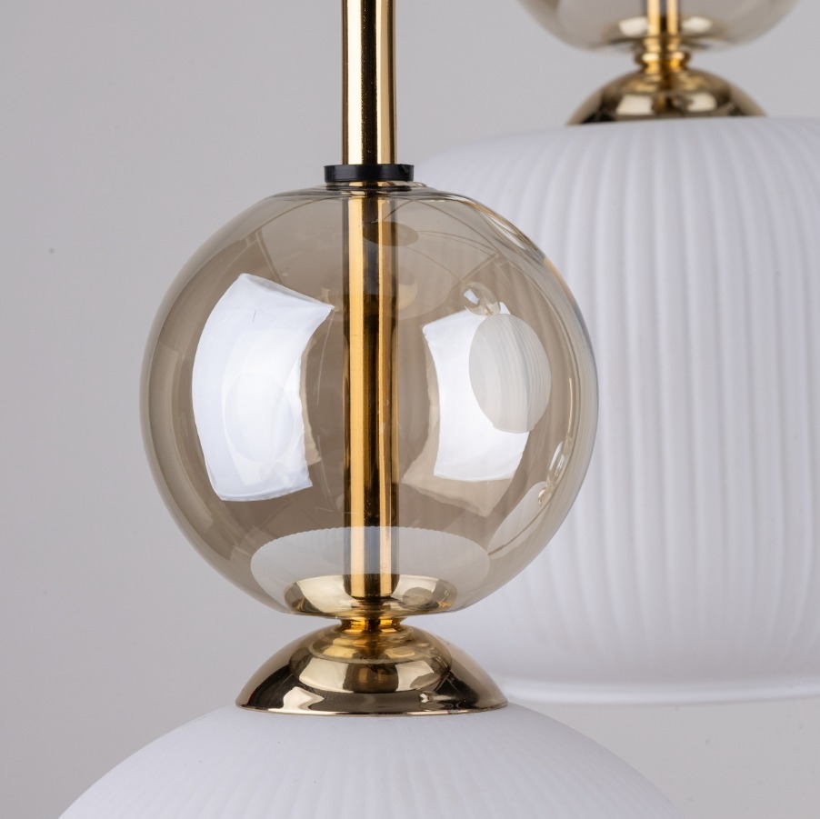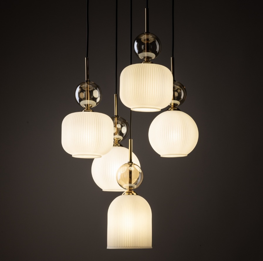 Pięć zwisów z mlecznobiałymi ryflowanymi kloszami o zróżnicowanych kształtach, które tworzą lekką kaskadę. Nad kloszami pojawiają się przydymione elementy w odcieniu cognac oraz smukłe, złote detale. Całość wygląda bardzo elegancko. Sprawdzi się nad stolikiem kawowym, w salonowej strefie wypoczynku albo w jadalni, gdy chcesz uzyskać dekoracyjne światło.