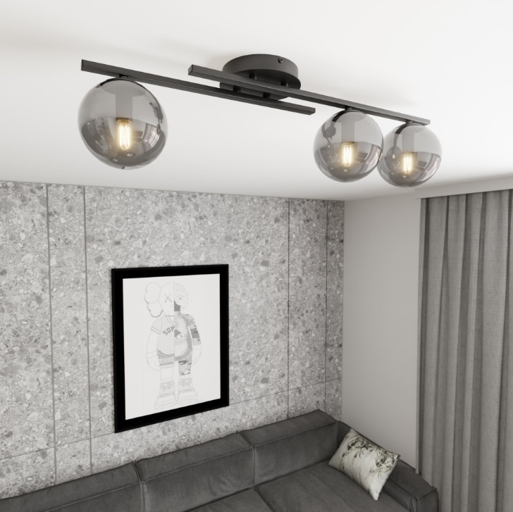 Elegancka lampa sufitowa Kairo 3 to nowoczesna oprawa z trzema kulistymi kloszami z dymionego szkła. Doskonale sprawdzi się w salonie, kuchni lub jadalni jako efektowne oświetlenie główne lub strefowe.
