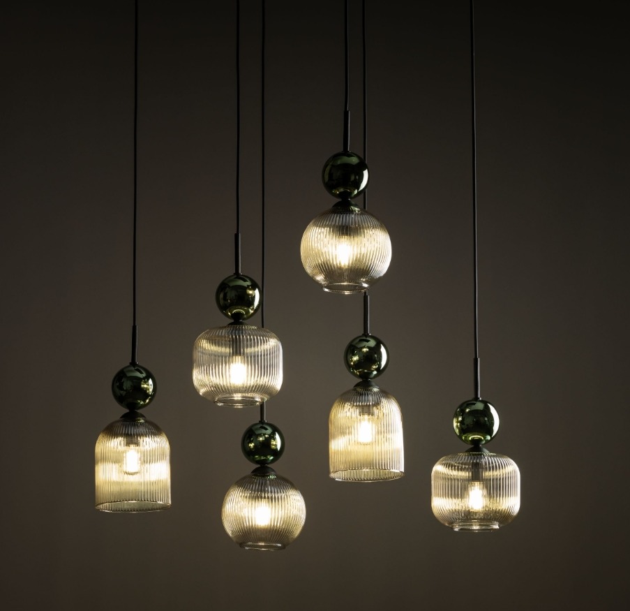 Elegancka lampa wisząca Sophia Green 6 z sześcioma ryflowanymi kloszami z koniakowego szkła. Czarna listwa i przewody przełamane zielonymi, dekoracyjnymi kulkami tworzą wyrazisty, elegancki akcent. Sprawdzi się nad długim stołem, wyspą albo w salonie nad strefą wypoczynku, bo sześć zwisów doświetli większą powierzchnię. Taki zestaw dobrze gra z drewnem, jasnymi tkaninami i dodatkami w odcieniach zieleni.