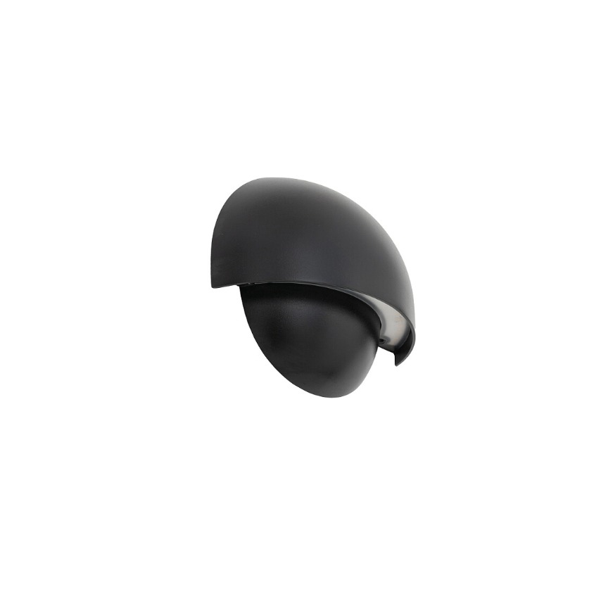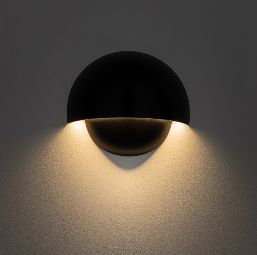 Minimalistyczny kinkiet zewnętrzny w kolorze głębokiej czerni. Po włączeniu tworzy przyjemną poświatę na ścianie (światło rozchodzi się po jej powierzchni), dlatego świetnie sprawdza się przy wejściu, na tarasie lub balkonie.