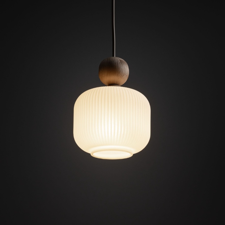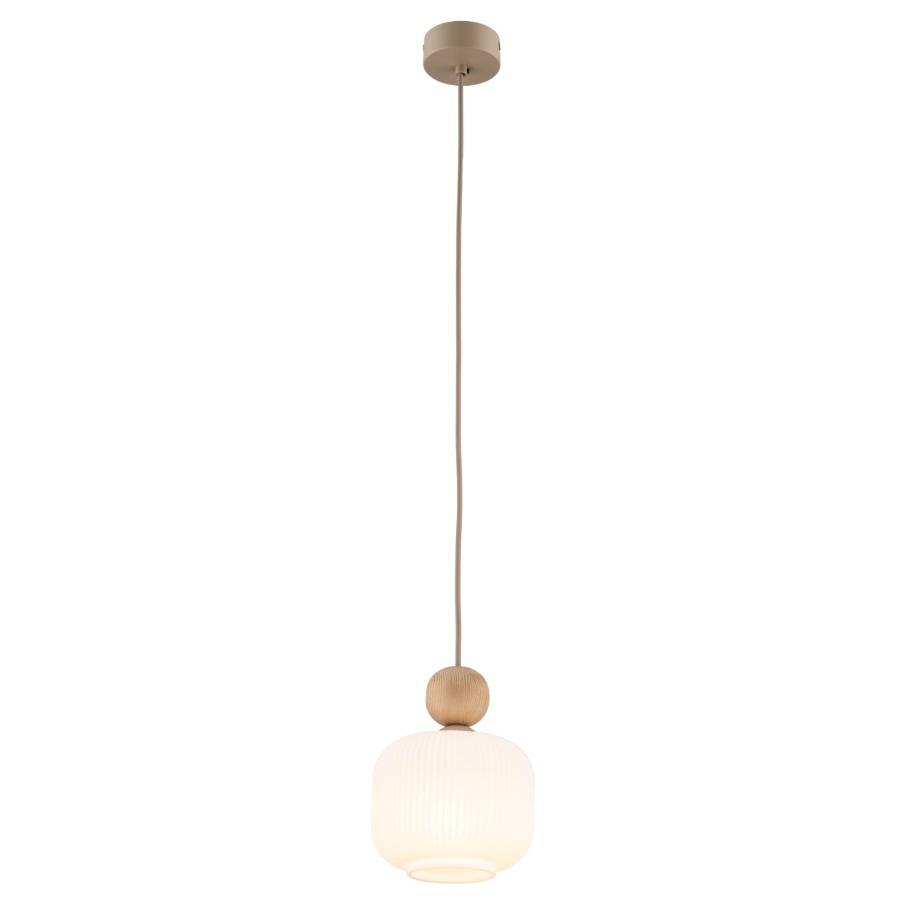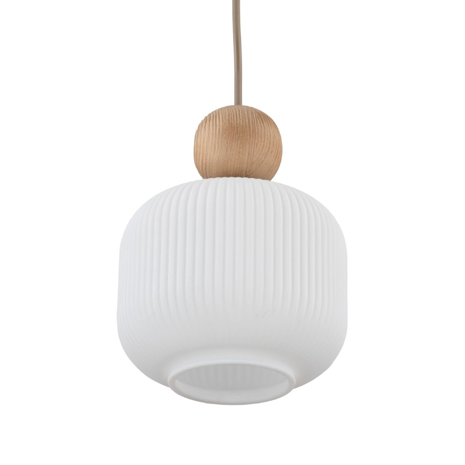Lampa wisząca w kolorze jasnego, piaskowego beżu (sabia) z ryflowanym, białym, szklanym kloszem. Światło przechodzi przez fakturę szkła łagodniej, więc zwis dobrze sprawdza się nad stolikiem, blatem albo jako pojedynczy akcent w sypialni i salonie.