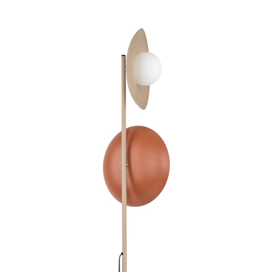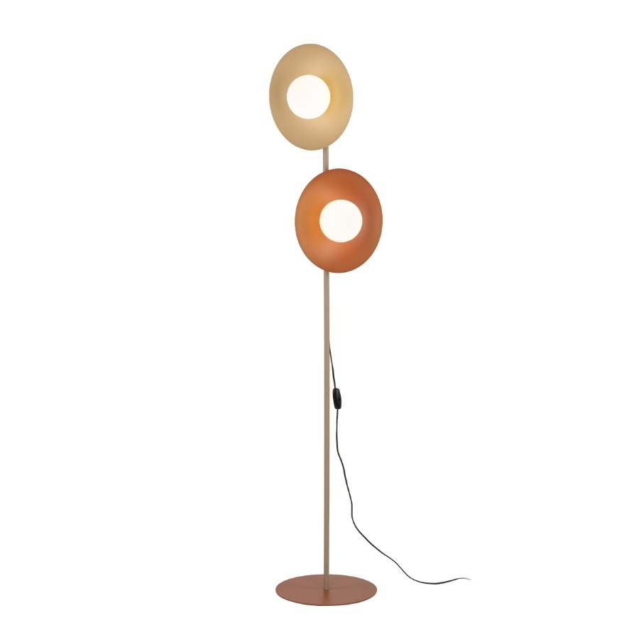 Lampa podłogowa Slate wygląda bardzo nowocześnie. Składa się z dwóch okręgów w różnych barwach, w których umieszczono mleczne kule ze szkła. Taki układ daje spokojne, przyjemnie rozproszone światło i jednocześnie dekoruje wnętrze nawet gdy lampa jest wyłączona. Postaw ją przy sofie albo w pustym narożniku. Szybko zamieni zwykłe miejsce w dopracowaną strefę wieczornego klimatu.