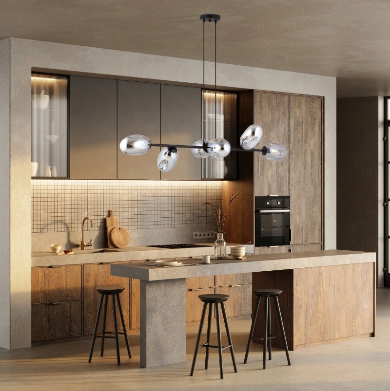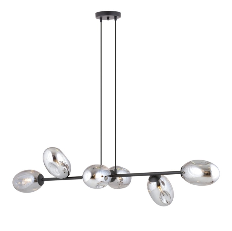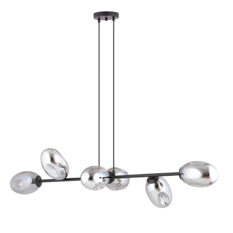Lampa wisząca z czarną konstrukcją i grafitowymi szklanymi kloszami. Przydymione szkło przyjemnie łagodzi światło i podkreśla dekoracyjne żarówki. Pandora 6 świetnie wygląda nad stołem w jadalni i nad wyspą w kuchni, szczególnie w aranżacjach modern loft, gdzie liczy się elegancki detal.