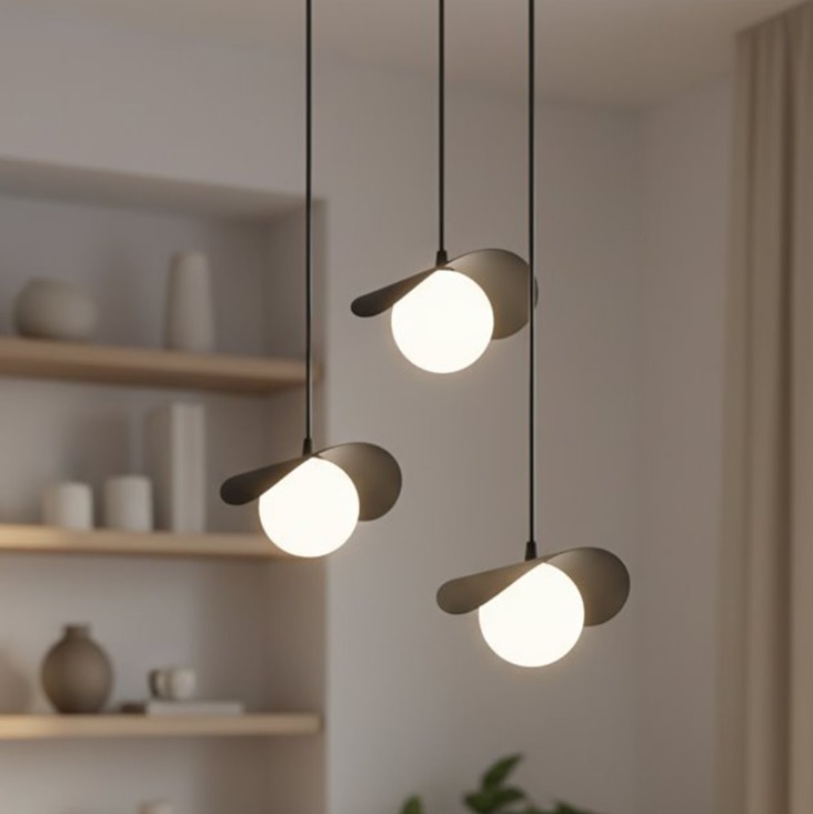 Nowoczesna lampa wisząca Ritual 3 to designerska oprawa z trzema kulistymi kloszami zawieszonymi na cienkich przewodach. Każdą kulę uzupełnia czarna osłona. Lampa emituje przyjemne światło idealne nad stół w salonie lub jadalni.