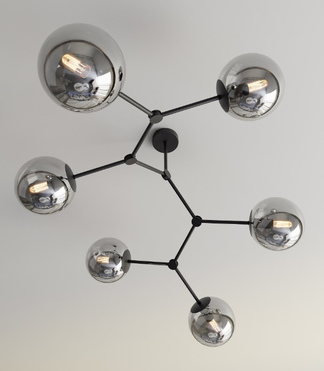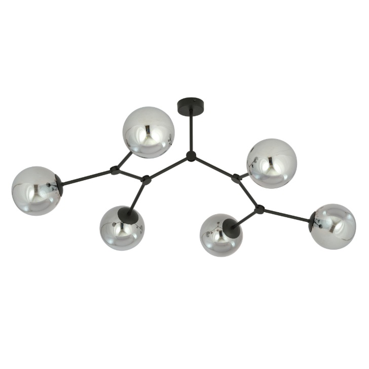 Żyrandol Space 6 to nowoczesna oprawa z geometryczną konstrukcją i sześcioma lustrzanymi, grafitowymi kulami ze szkła. Rozbudowany układ ramion zapewnia wielopunktowe oświetlenie i jednocześnie stanowi mocny akcent dekoracyjny w dużych wnętrzach. Idealny do przestronnego salonu, jadalni lub strefy dziennej.