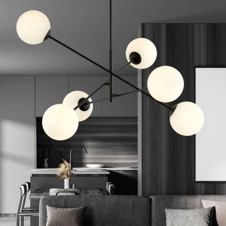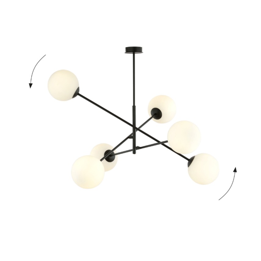 Nowoczesny żyrandol Linear 6 w czarnym wykończeniu z sześcioma opalowymi kulami daje miękkie rozproszenie i przyjemną jasność bez ostrego blasku. Smukła konstrukcja wygląda lekko i pasuje do wnętrz nowoczesnych, szczególnie nad dużym stołem w jadalni, w salonie albo w przestronnej kuchni.