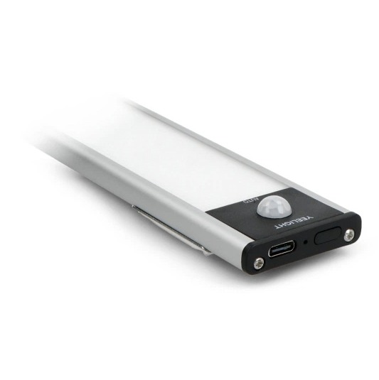 Srebrna lampka do szafy Closet Light ma smukła, podłużną, kompaktową formę, dzięki czemu mieści się w szafie lub pod półką. Wbudowany czujnik ruchu uruchamia światło, gdy wykryje Twoją obecność.