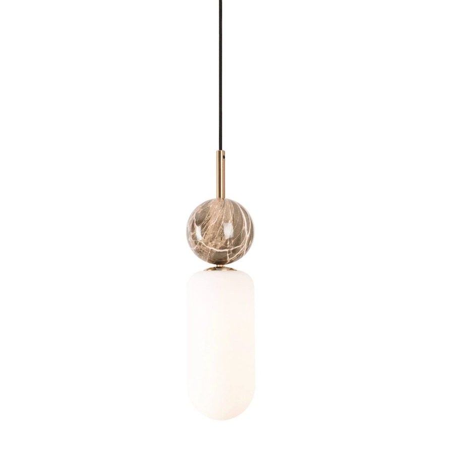 Smukła lampa wisząca w złotym wykończeniu z dekoracyjną kulą i podłużnym, mlecznobiałym kloszem ze szkła. Taka forma wygląda elegancko. Dobrze sprawdza się pojedynczo nad stolikiem lub w kilku sztukach nad wyspą/blatem.