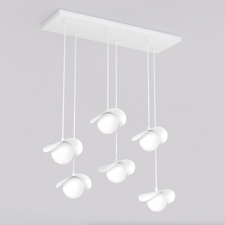Żyrandol Ritual 6 to nowoczesna lampa wisząca w białym kolorze. Składa się z sześciu kulistych kloszy zawieszonych na cienkich przewodach, które tworzą efekt przestrzennej kompozycji. Mleczne kule dają rozproszone światło sprzyjające przyjemnej atmosferze przy stole. Lampa świetnie sprawdzi się w jadalni lub salonie urządzonym w stylu nowoczesnym, japandi lub skandynawskim.
